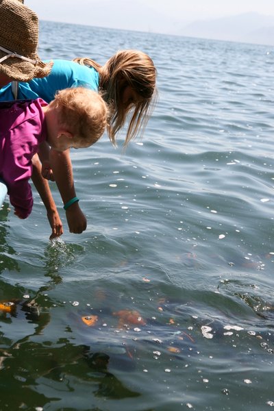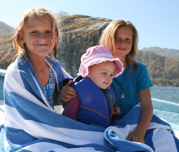 Pedro first took us to the Los Arcos, just north of Mismaloya for some snorkeling. The girls and I jumped in. It was a bit cold for the younger girls, so they got out, but not before seeing some of the hundreds of purple and orange Angel Fish that we attracted. Alex and I relived our Barrier Reef adventure and saw even more fish on the reefs and against the rocky islands.