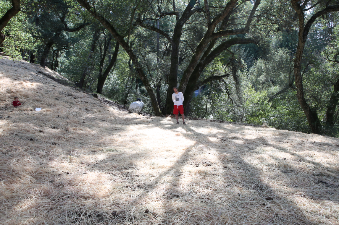 Ya! Finally we are started on our renovation adventure. First off we are working on getting a new septic system in. After that we are having the earth movers flatten out the land so we can add a grassy area for the girls to play and a veggie garden. Down below we will flatten out that area a little more and will be another play area for the kids under the oaks. Hoping to get a jungle gym, swings and trampoline down there. In between that area on the existing slope we are hoping to plant some vines. We’ll see!