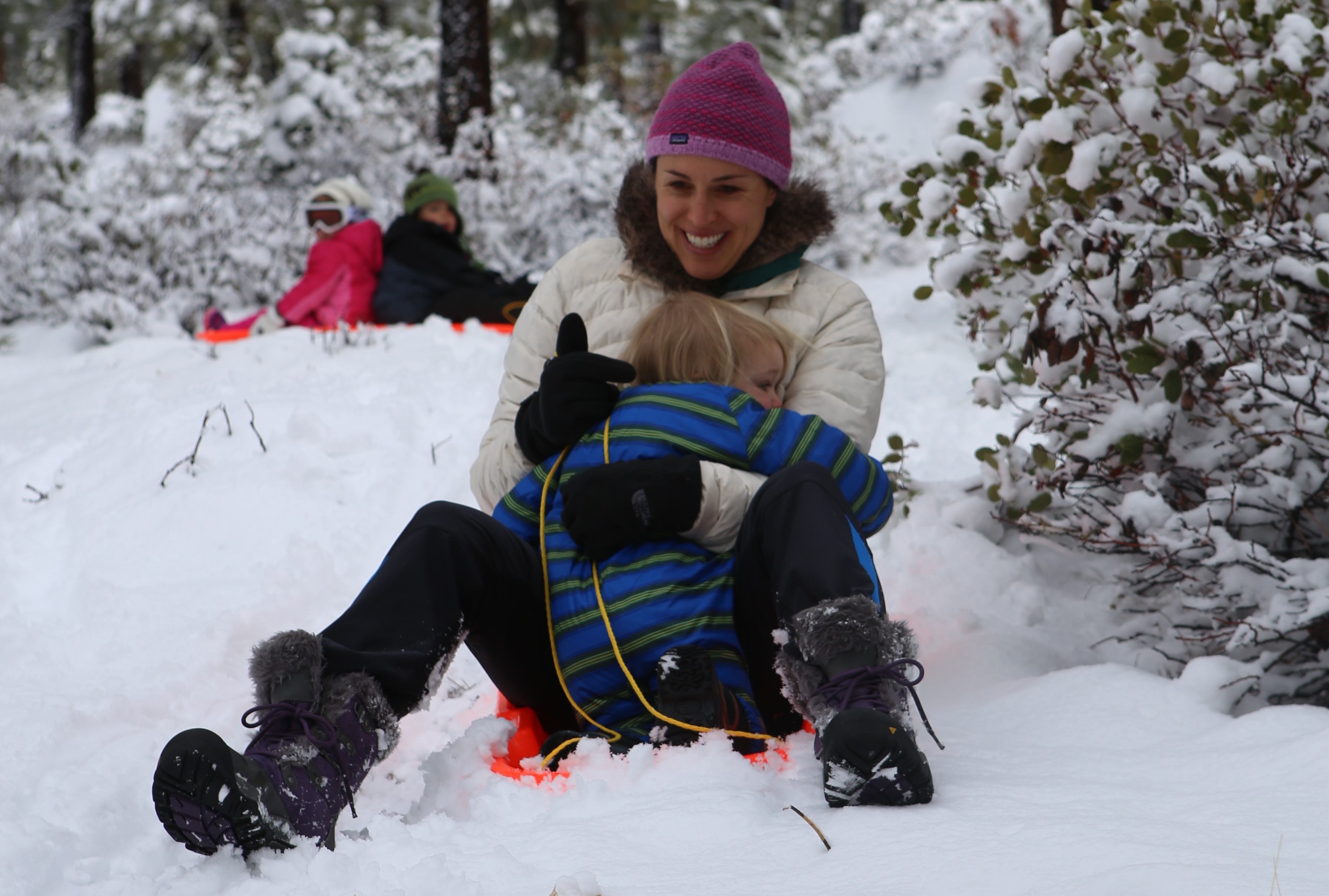 We had the best weekend up in Tahoe at the Naylor’s. It has finally snowed enough to go sledding in their backyard. Page and Nic were super charged all weekend, sledding, skiing, sledding, playing, hot cocoa… Hannah and Sienna got their intro to sledding, too. Huge props to Nora and Tim for opening their home to us, great fun and conversations. But I still think Nora and I deserve a medal for orchestrating this sledding session. Yes, the Dad’s were out touring… But it was so worth it. Such a great time!